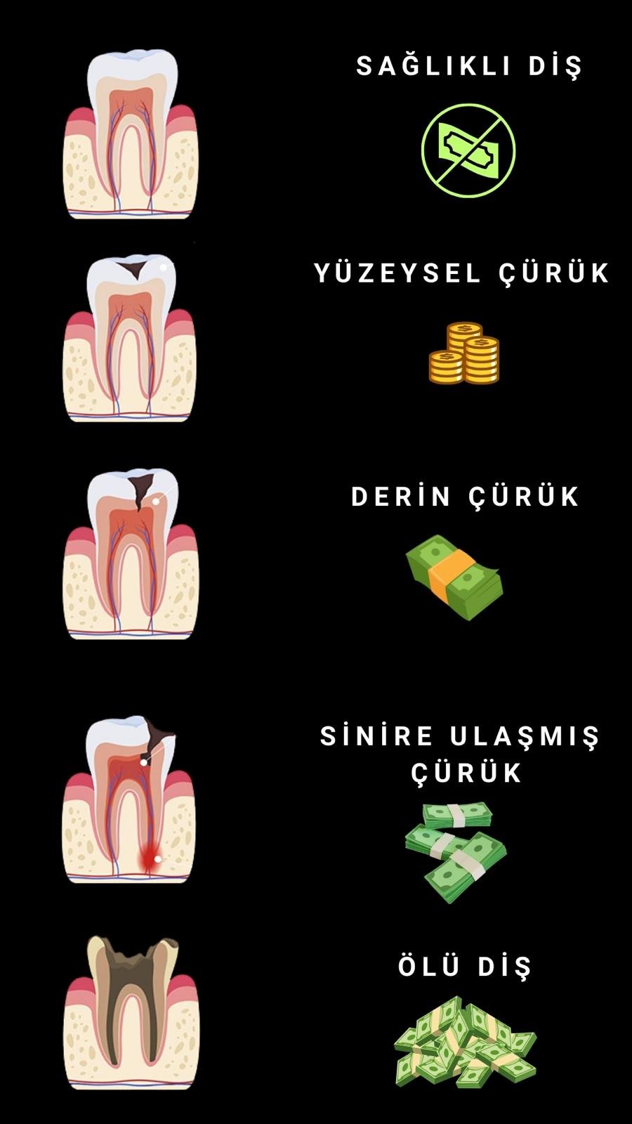 Küçük bir dolgu ile çözülebilecek yüzeysel bir çürük, ilerleyerek kanal tedavisine;